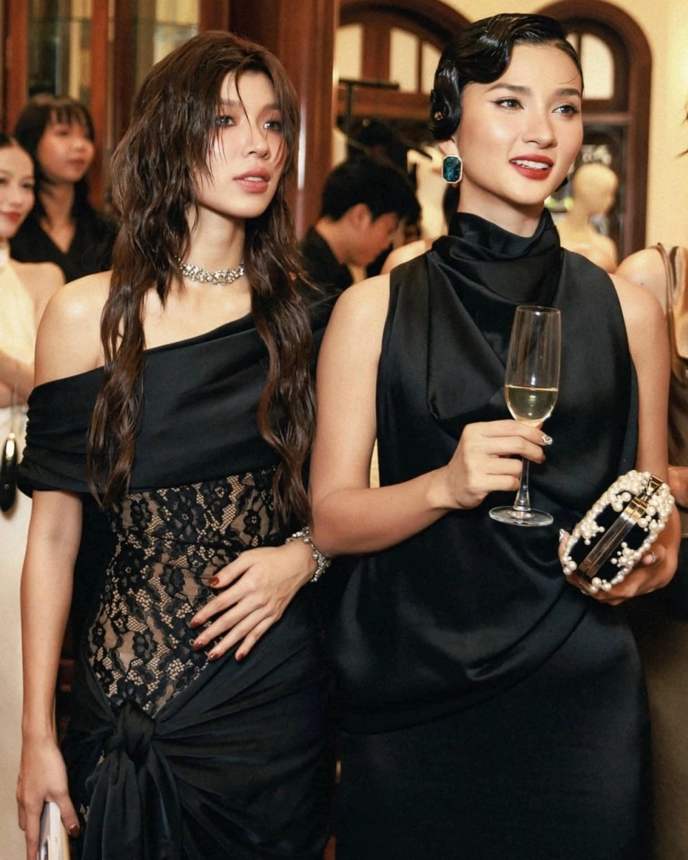Dự một buổi tiệc, Kim Tuyến chọn tông trang điểm cổ điển với tóc rẽ ngôi. Đồng Ánh Quỳnh theo phong cách hiện đại, gợi cảm với váy hở vai phối ren.
