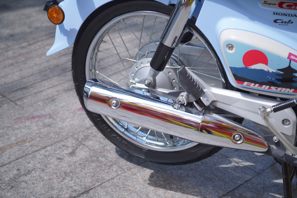 Điểm đặc biệt nhất trên mẫu xe Cub của Honda là dàn áo phối màu xanh dương. Đi kèm là các tem dán ở ốp hông, vè chắn bùn phía trước với biểu tượng núi Phú Sĩ và mặt trời mọc.